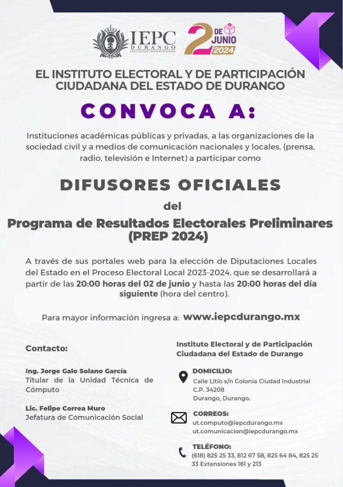 La convocatoria es dirigida a Instituciones académicas públicas y privadas, a las organizaciones de la sociedad civil y a medios de comunicación tanto nacionales como locales y, señala los requisitos específicos que deberán cumplir los interesados en participar como Difusor Oficial, entre los que se encuentra el formato de manifestación de intención para ser difusor oficial del PREP Durango 2024, debiéndose presentar a más tardar el 18 de mayo de 2024.