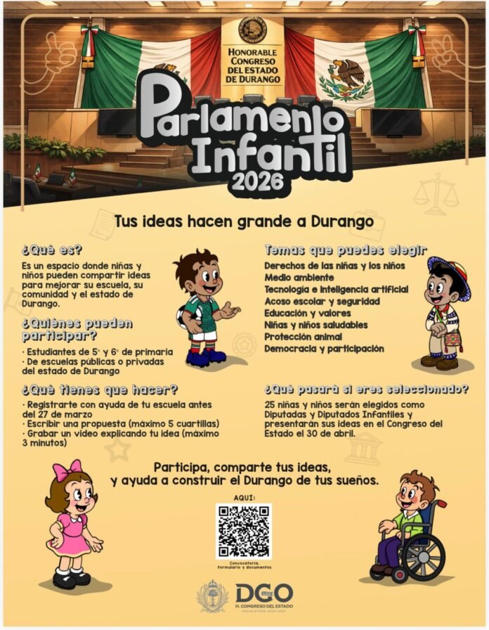 El Congreso del Estado de Durango reporta una amplia respuesta a la convocatoria del Parlamento Infantil 2026, ejercicio que ha logrado sumar la participación de niñas y niños provenientes de los 39 municipios de la entidad, tanto de instituciones públicas como privadas.