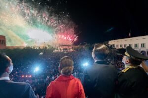 Después de entonar el himno nacional y realizar honores a la bandera mexicana, el cielo se iluminó con los tradicionales fuegos artificiales, que con sus colores y luz, hicieron vibrar de emoción a los asistentes.