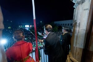 Con la plaza IV Centenario repleta y luego del protocolo solemne, el Mandatario Estatal acompañado por su esposa, Marisol Rosso, del General de Brigada de la Décima Zona Militar, Isaac Bravo López, del presidente de la Junta de Coordinación Política del Congreso del Estado,Héctor Herrera; el alcalde Antonio Ochoa y el Magistrado Presidente del Tribunal Superior de Justicia, Ángel Bonilla Saucedo, salió al balcón del museo “Francisco Villa” y con firmeza y emoción tocó la campana y gritó: ¡Viva México!, arenga de independencia que fue replicada por los cientos de duranguense en una sola voz.