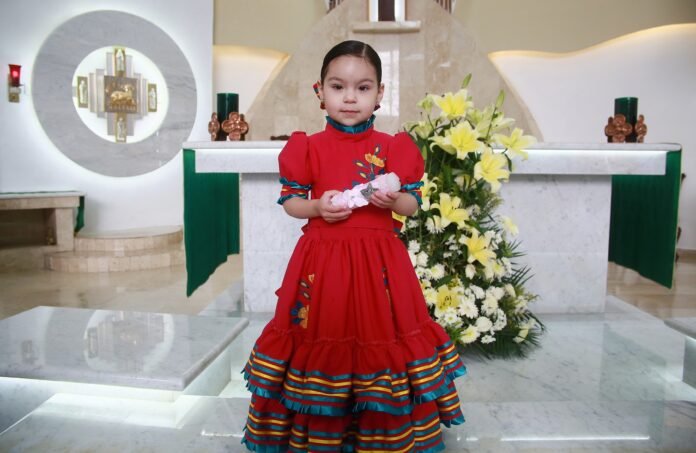 Con un diseño inspirado en las tradiciones mexicanas, así lució la tierna Fátima Regina Nevárez Álvarez, quien portó un auténtico vestido de escaramucita; maravilloso día fue para toda la familia, lleno de alegría por ver la presentación de 3 años de la dulce niña, evento que se llevó a cabo en el Templo de Santa Rosa de Lima, donde recibió el bello ritual religioso.
