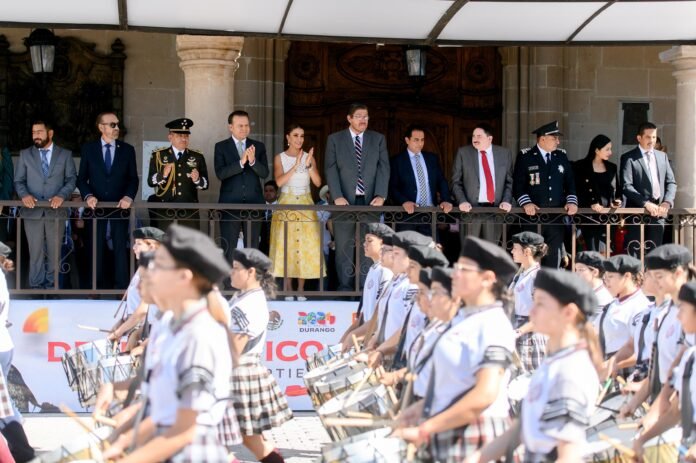 Allí, el Gobernador junto a su esposa Marisol Rosso, el Comandante de la Décima Zona Militar, Issac Bravo López, miembros del Gabinete Estatal y Municipal, presenciaron el tradicional desfile, que reunió a cientos de familias duranguenses y visitantes para celebrar juntos las fiestas patrias con emoción y mucha alegría.