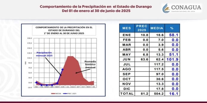 El inicio de la temporada de lluvias en Durango arrancó con indicadores positivos para este 2025, así lo dio a conocer la Comisión Nacional del Agua (Conagua)a través de su Dirección Local, en sus reportes de acumulado de lluvia al cierre del mes.