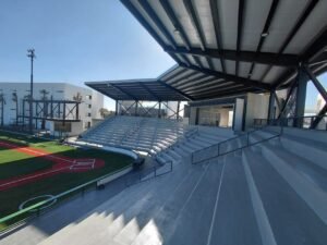 Asimismo área de comer para los equipos en dos niveles, techumbre en gradas, alumbrado para el campo, es importante mencionar que es el segundo espacio dentro de la universidad con iluminación.