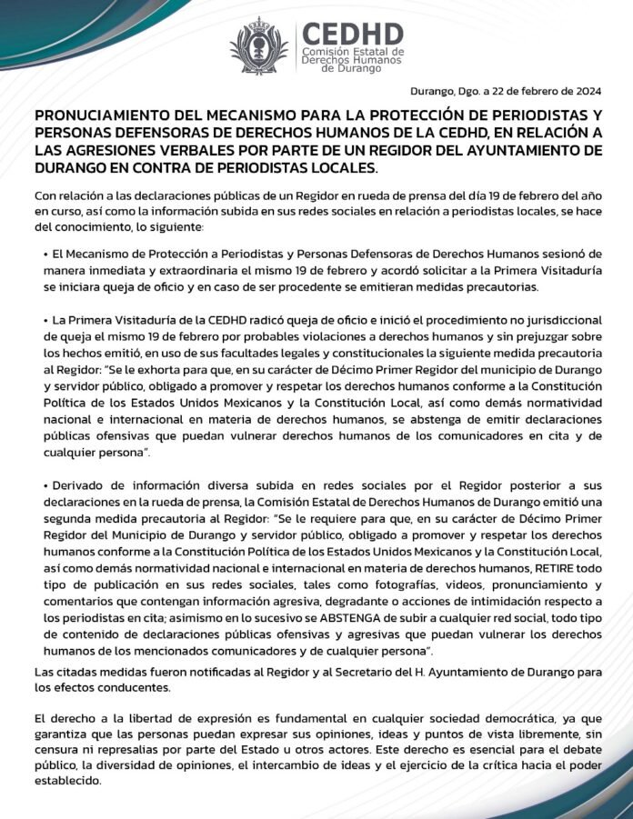 Al ser radicada ese mismo día la denuncia ante este organismo, como primer medida precautoria ante una posible violación de Derechos Humanos, instoó al Décimo primer Regidor del Ayuntamiento para que se abstengs de emitir cualquier declaración pública ofensiva en contra de los comunicadores.