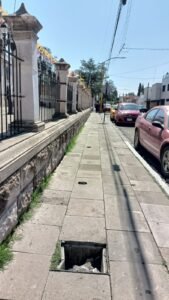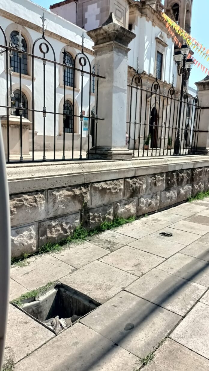 Atendiendo el llamado de varias personas que con cierta periodicidad caminan por la banquete frontal del templo de Nuestra Señora de los Ángeles, respecto al peligro latente que significa un registro sin tapa en la zona peatonal, acudimos al sitio para dar cuenta en efecto, del riesgo que ahí existe para todos quienes tienen necesidad de pasar por el lugar, pero sobre todo, para las muchas personas de la tercera edad y discapacitados.