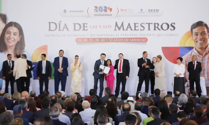 El gobernador Esteban Villegas Villarreal, reconoció a 688 maestras y maestros de Durango y La Laguna en su día, quienes cumplieron 10, 20, 25, 30, 40 y 50 años de servicio comprometido con la niñez y juventud de Durango, con la entrega de estímulos y recompensas por su trabajo y vocación.